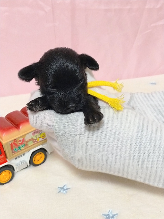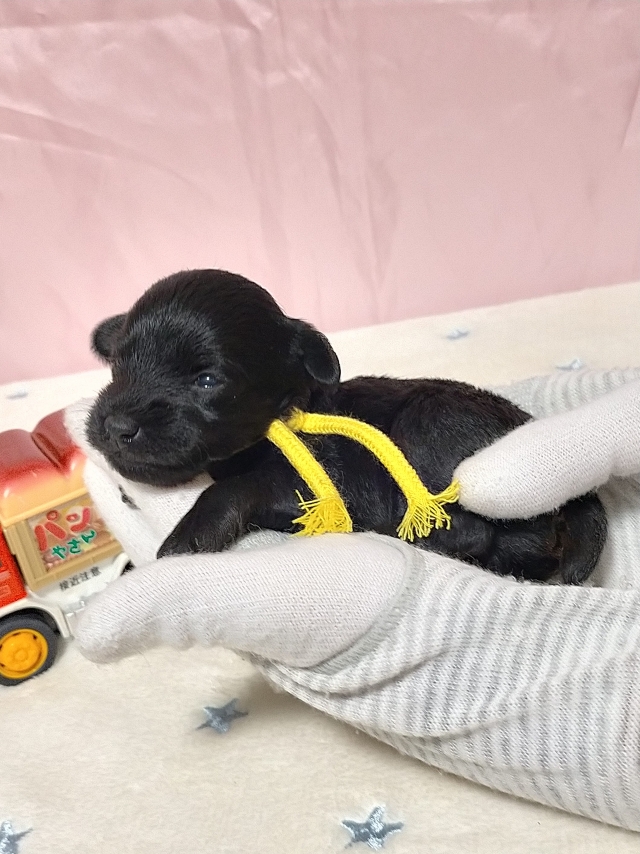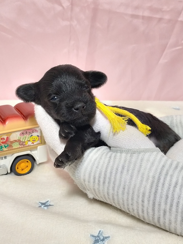 コメント | チビっちゃすぎるモモちゃん3回目の出産です! チビクロ3兄妹!オールブラックス見参! 黄色リボンの男の子!すくすく成長中! ※9/29断尾済 母犬:モモちゃん ブラック&シルバー 体高:24cm 体重:2.9kg 父犬:別ブリーダーさん所有 ブラック&シルバー 5.5kg 遺伝子検査:DM編成性脊髄症 クリア 第Ⅶ因子欠乏症 クリア |