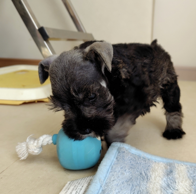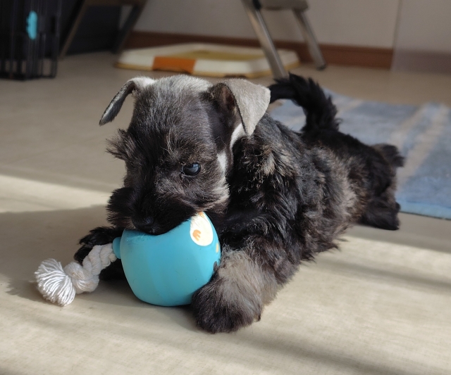 9月2日に6月26日生まれの男の子を自然豊かな奈良の上田ブリーダーさんから迎えました。ご夫婦で、シュナウザー専門で育てておられます。奥さまがトリマーさんなので、お風呂にいれてもらって、可愛いベビーカットもしてもらってました。シュナッチとワンちゃんたちを呼んで、本当に大事に育てておられます。7月に13歳8ヶ月で旅立った同じシュナの先住犬が、子犬で来たときと本当に違って、食欲旺盛で、よいウンチとしっかりオシッコしてくれています。兄弟や家族と別れてひとりになるからさみしがるのでは、と上田さんにお聞きしましたら、うちでは抱っこも順番待ちなのが、いっぱいひとりで抱っこしてもらえるからきっと大丈夫ですよ、と言ってくださいました。愛されて赤ちゃん時代を過ごしたことがすごくわかる人懐っこい性格です。このご縁を感謝しながら大切に育てていきたいと思っております。素敵なブリーダーさんです。これからも、上田さんと新しい飼い主さんたちのたくさんの良いご縁が繋がりますことを心より願っております。(大阪府 女性)